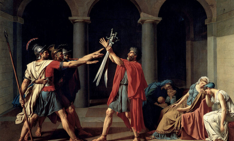 S’il se tourne vers les modèles antiques, notamment ceux de la République romaine, c’est pour y puiser un idéal moral et politique, incarnant à ses yeux un exemple d’unité sociale, de vertu civique et de liberté, qu’il voulait traduire en art au service d’une société nouvelle, nous explique Alain Vircondelet (3).