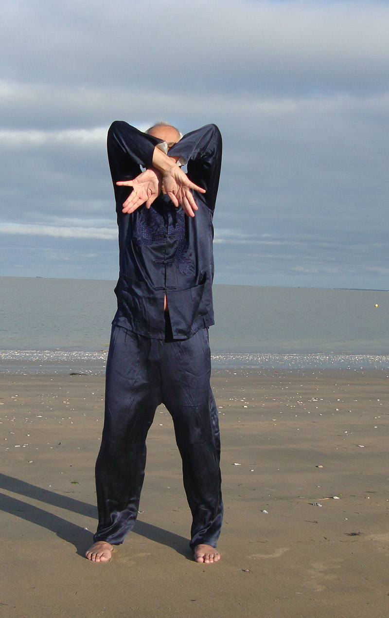 Inspirer doucement en croisant les bras, et en les relevant de la façon suivante : le moteur du mouvement est dans les épaules, puis dans les coudes, le bout des doigts reste dirigé vers le bas.